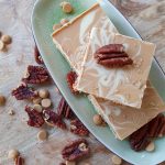 Shortbread bodem met een dikke laag caramel met pecannoten en daarop een laag “gouden” Chocolade